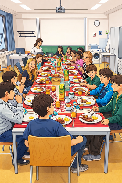 Die 2K-Klasse tauchte am 17.April im Englischunterricht in die britische Kultur ein und bereitete gemeinsam ein traditionelles Full English Breakfast zu. Jede Schülerin und jeder Schüler brachte eine Zutat mit, sodass zusammen gekocht, der Tisch passend dekoriert und natürlich auch gemeinsam gegessen werden konnte. Begleitend dazu wurde das Thema auch theoretisch im Unterricht erarbeitet - so wurde Englischlernen zu einem genussvollen Erlebnis.
