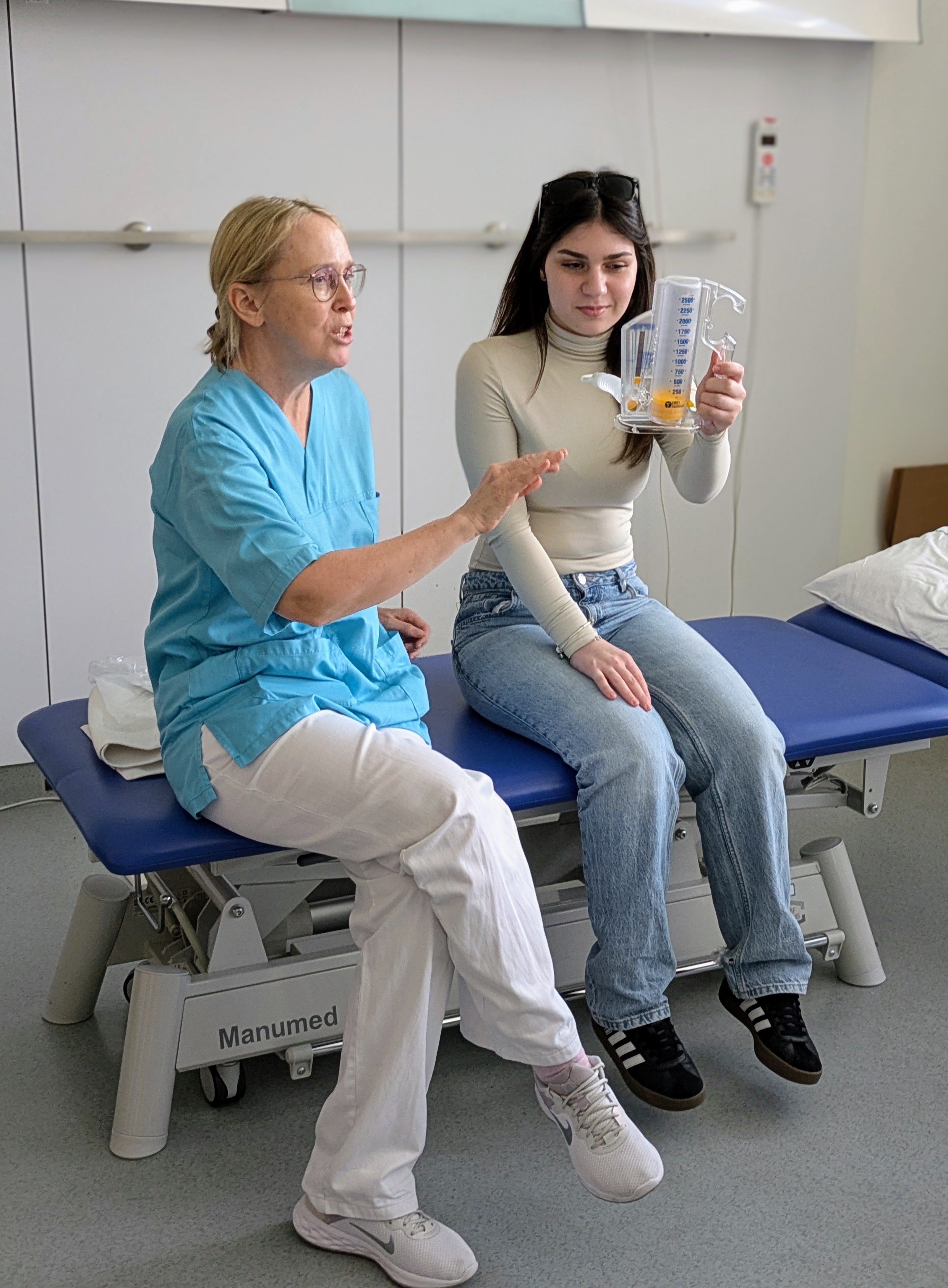 Die Schülerinnen und Schüler erhielten nicht nur spannende Einblicke in unterschiedliche Gesundheitsberufe, sondern konnten auch hinter die Kulissen des Krankenhausbetriebes blicken. Sie probierten Pflegebetten aus – sowohl aus der Patientenperspektive als auch in der Rolle einer Pflegefachkraft – und gewannen einen praktischen Eindruck von der Physiotherapie, insbesondere von Mobilisationsmaßnahmen, die sie selbst testen durften.
